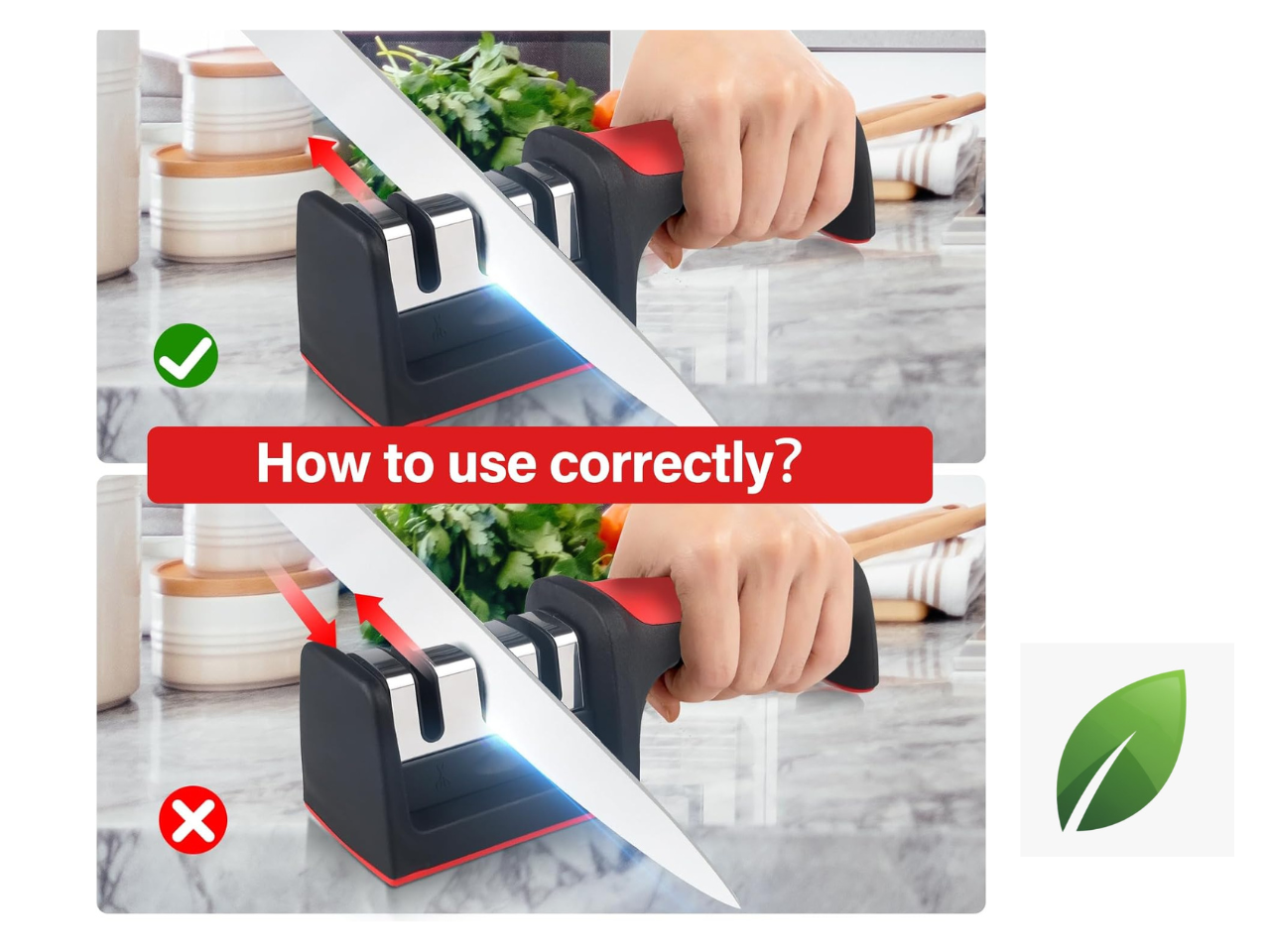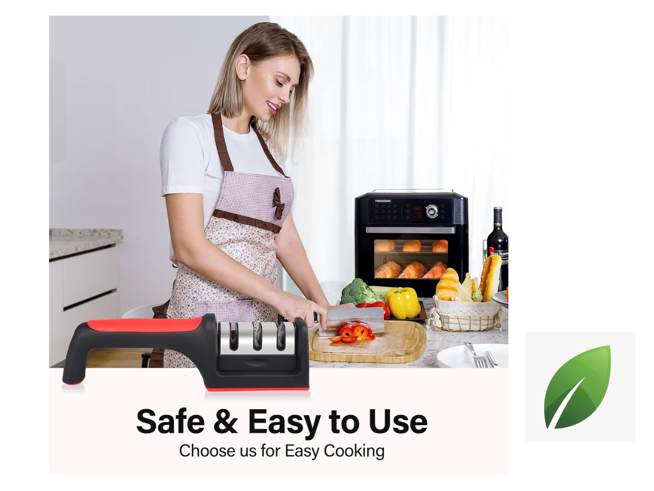 Afilador de cuchillos manual con 3 etapas para reparar, moler y pulir, logrando filos precisos y como nuevos en segundos.