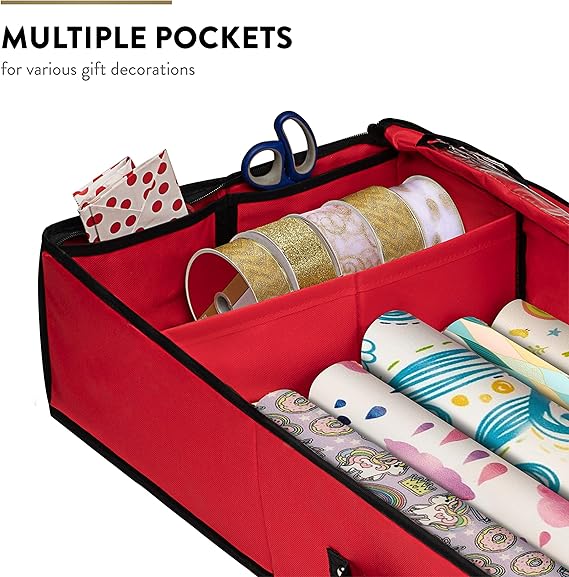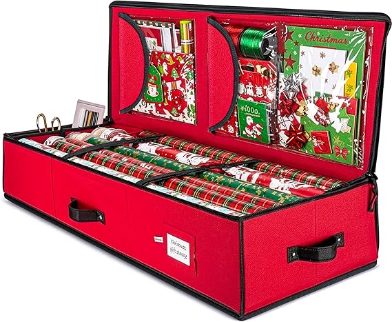 Mantén todo tu espíritu navideño organizado en un solo lugar. Caja resistente y espaciosa para guardar adornos, luces, bolas y papel de regalo.